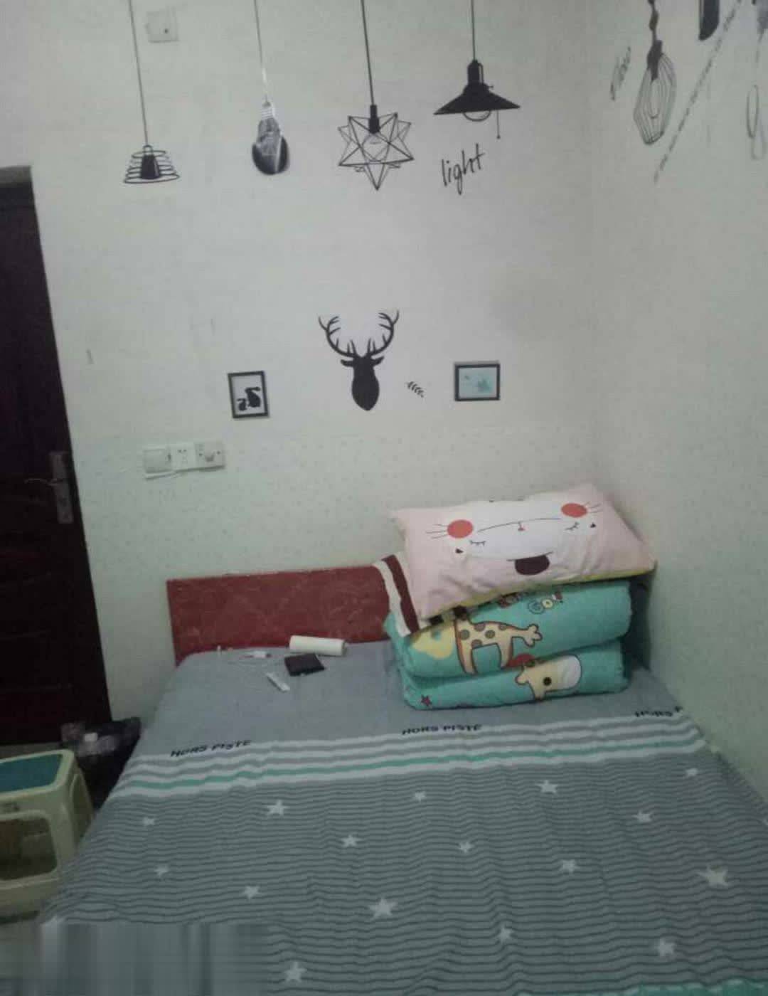 床边的墙面也贴了一圈壁纸,上面还贴了墙贴。
